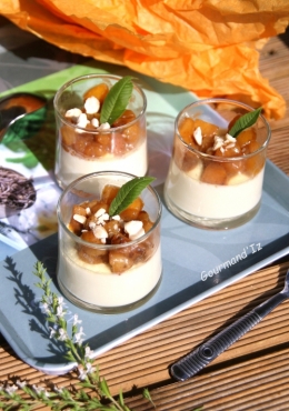Panna cotta verveine, pêches vanillées poêlées au miel d'oranger